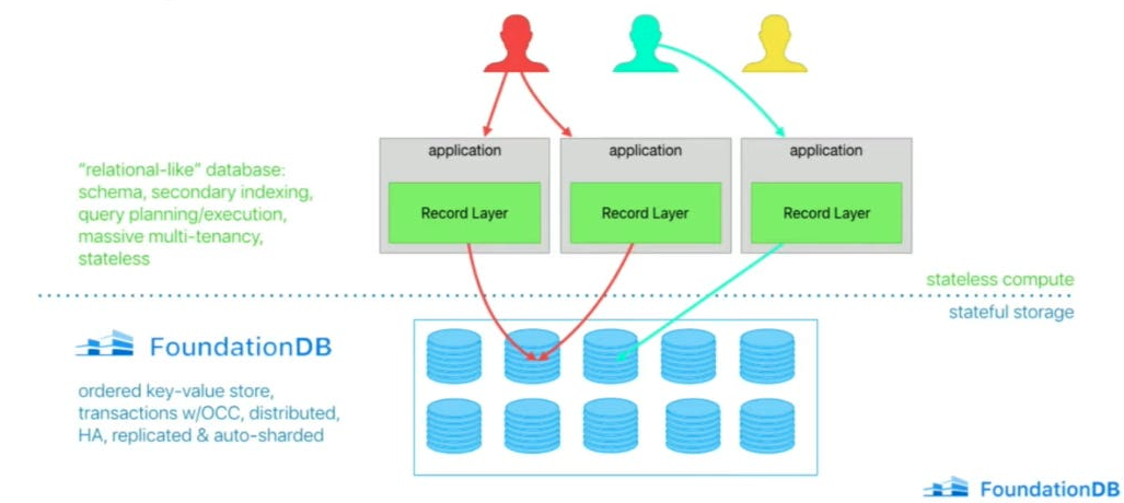 • FoundationDB 负责所有分布式系统和并发控制工作。