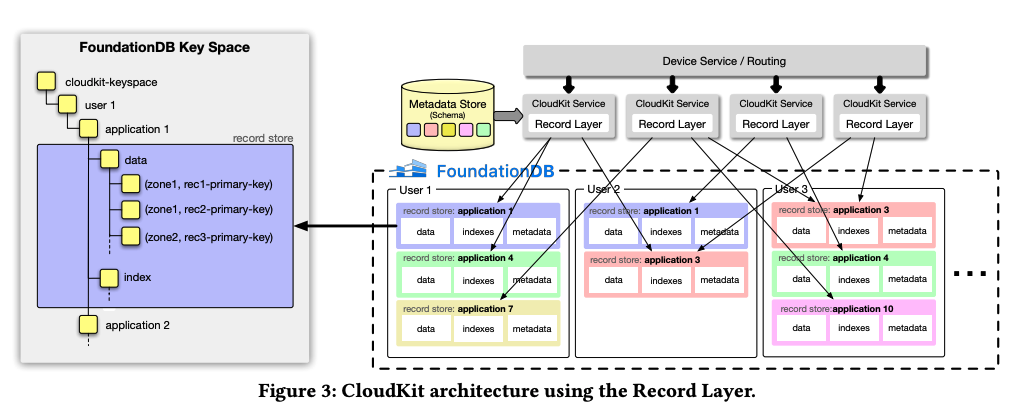 在 FoundationDB 记录层论文中,他们写道:“[FoundationDB 记录层用于]为服务于数亿用户的应用程序提供强大的抽象。CloudKit 使用记录层来托管数十亿个独立数据库,其中许多数据库具有共同的模式。”