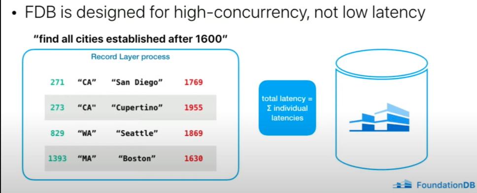FoundationDB 是为高并发而不是低延迟而设计的。这意味着它可以同时处理大量任务,而不是专注于单个任务的速度。