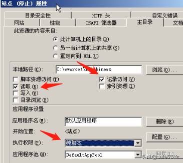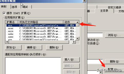 5、删除不必要的应用程序扩展 IIS默认支持.asp、.cdx等扩展名的映射,除了.asp之外其他的扩展几乎用不到。这些拓展加重了服务器的负担,而且我们知道,没有限制.asa或者.cer等拓展名,黑客可以利用上传漏洞进行攻击。 站点属性->主目录-配置->删除.asa和.cer等拓展