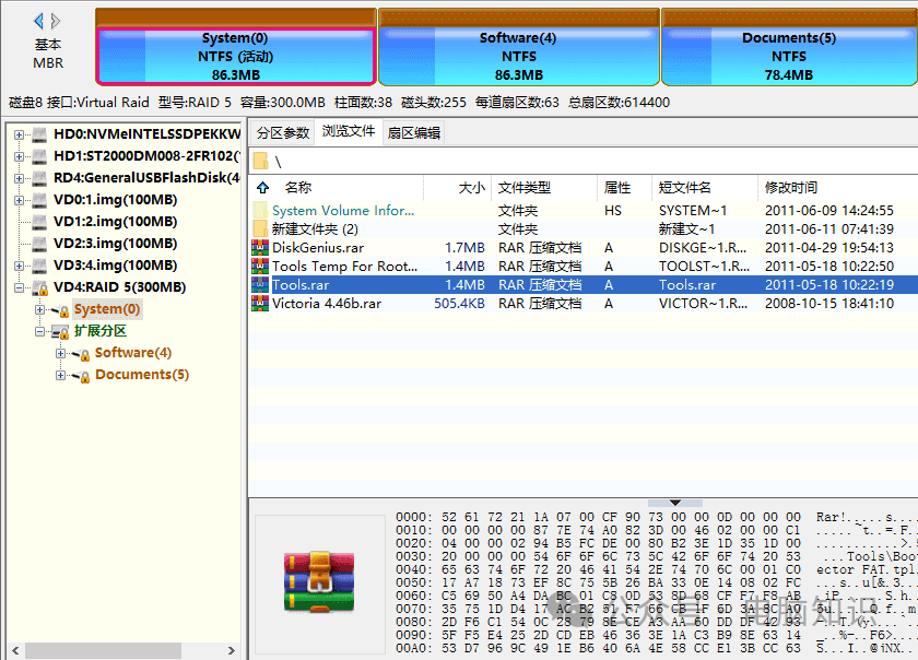 步骤三:恢复数据。 虚拟RAID组建成功后,在软件中就可以像操作普通硬盘一样来操作这个虚拟RAID 了。如果可以直接看到丢失的数据,将数据复制到其他的盘即可。