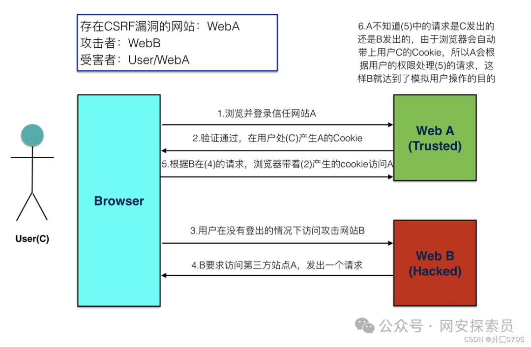 概念:由于网站对用户网页浏览器的信任导致用户在当前已登录的Web站点的状态下,访问攻击者构造的攻击连接从而执行非本意的操作的漏洞。