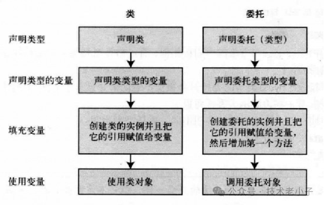 委托的语法比较简单,使用关键字“delegate”定义一个委托类型,然后在需要使用委托的地方使用“=”操作符将其赋值给委托变量。委托类型定义了一个类型签名,类似于C++中的函数指针类型。