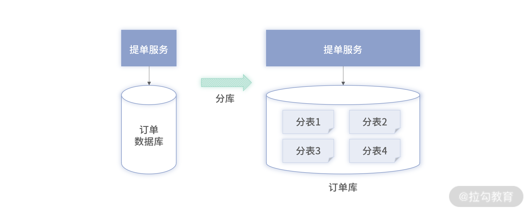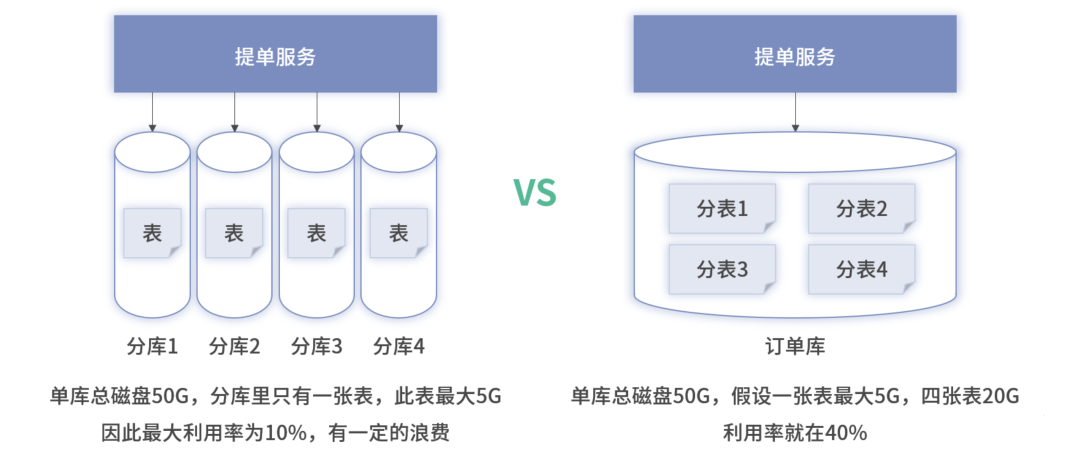 以本模块的订单案例来说,假设订单只是 单量多而每一单的数据量较小,这就适合采用分表。单条数据量小但行数多,会导致写入(因为要构建索引)和查询非常慢,但整体对于容量的占用是可控的。采用分表后,大表变成小表,写入时构建索引的性能消耗会变小,其次小表的查询性能也更好。如果采用了分库,虽然解决了写入和查询的问题,但每张表所占有的磁盘空间很少,也会产生资源浪费。两种方案的对比如下图 3 所示: