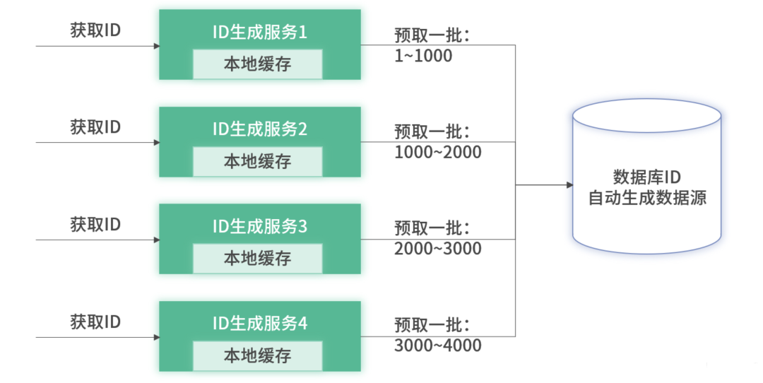 但如果每次获取 ID 时,ID 生成服务都需要从数据库实时获取,性能会比较差。为了解决性能问题,可以在生成 ID 的数据库前置一个具备持久化功能的内存缓存,预生成一批 ID。具体架构如下图 5 所示: