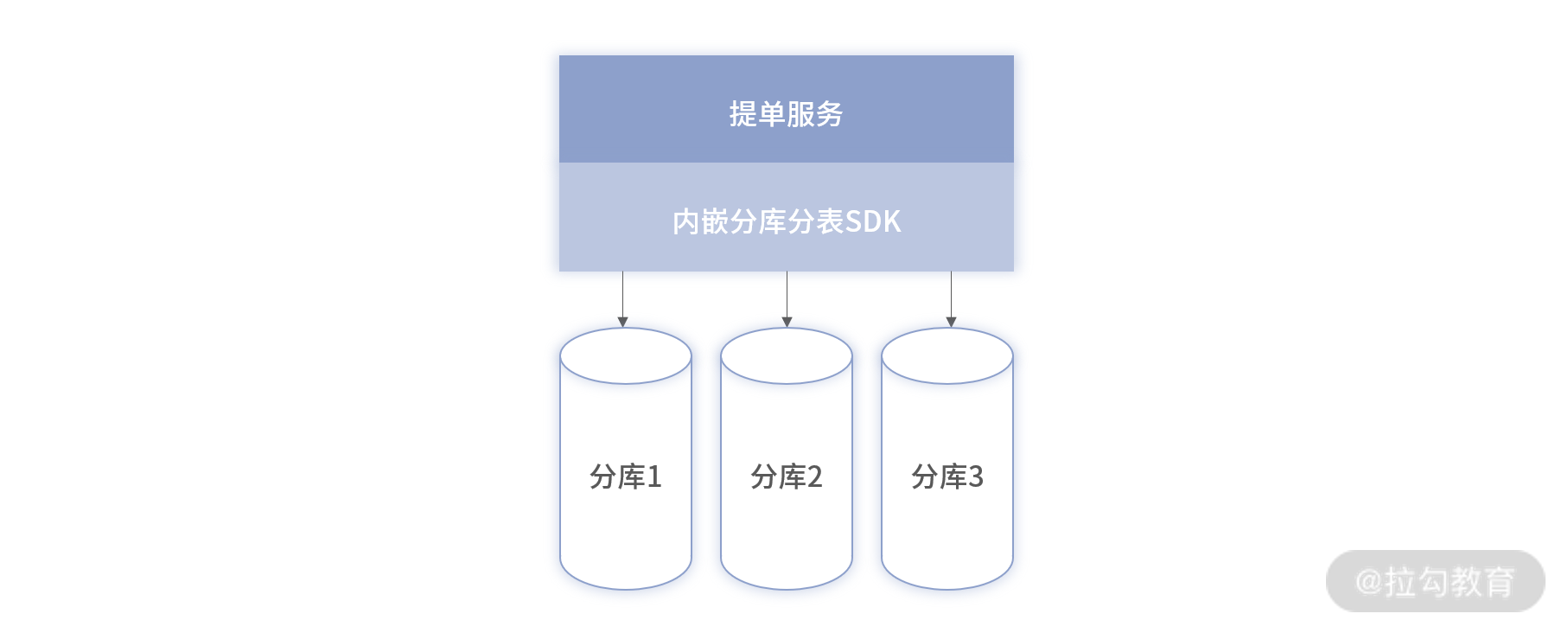 内嵌式分库中间件 是将分库中间件内置在业务应用中,它只负责分库的选择,并不会解析用户的 SQL。在使用时,业务应用需将分库字段传递给内嵌中间件去计算具体对应的分库。它相比代理式性能更好。内嵌式的架构如下图 7 所示: