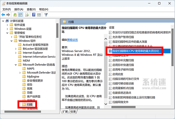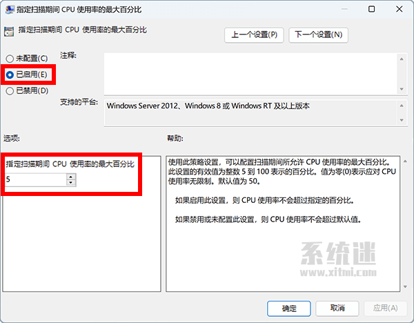 3、右侧栏找到“指定扫描期间CPU使用率的最大百分比”,双击打开。4、选择勾选“已启用”,把下方最大百分比数值改为5,点确定。如此一来,Defender频繁扫描占用大量CPU,导致电脑卡顿的问题就解决了。值得一提的是,Windows原来默认设置,允许最大百分比是50%。你可以想一下,本来运行个软件游戏啥的,就已经占了挺多CPU。要是Defender又在后台搞事情,分分钟钟就能把CPU占用率干到100%。这电脑不卡才怪呢,你要不歇着等它扫描完,电脑过会儿应该会正常。可下次依旧会后台自动扫描,所以还不如把它限制起来,一劳永逸。