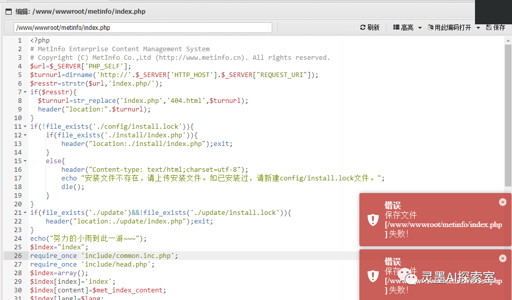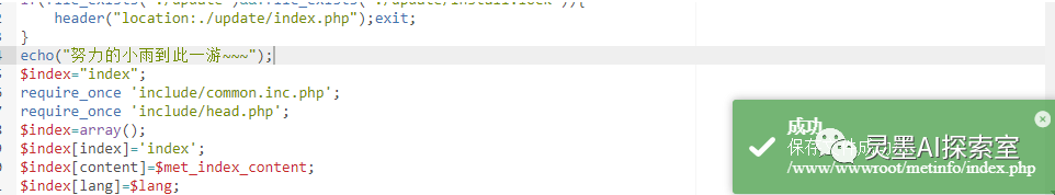 我来执行一下 find index.php -exec chown www:index.php \; 试一试看看是否可以成功,哎呦,大功告成。我再次去保存一下文件内容看看是否可以保存成功。