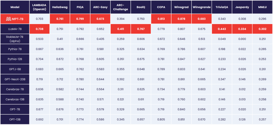 来源 | Latent Space OneFlow编译 翻译|贾川、杨婷、宛子琳 上下文长度曾是GPT-3的最大限制之一。GPT-3最多只能接收4000个词元(3000词,6页),否则就会报错。因此,为处理长文档和提示(prompt),就需要引入 LangChain 等其他检索技术。不过,MosaicML(已被Databricks以约13亿美元收购)在5月初开源的MPT-7B上下文长度可达84000个词元(63000个词,126页),大大扩展了可处理的文本范围,随后,Anthronpic公司开发的Claude模型的上下文长度扩展到10万个词元。 MPT-7B是从头开始训练的,使用了1万亿个词元的文本和代码作为训练数据。相比其他类似模型(如Pythia和OpenLLaMA使用了3000亿个词元,StableLM使用了8000亿个词元),MPT-7B的训练数据规模更大,其质量可与LLaMA-7B相媲美。该模型在MosaicML平台上进行训练,使用了440个GPU,训练过程耗时9.5天,并且没有人为干预,成本约为20万美元。与其他开放模型不同,MPT-7B开放了商业使用许可,并利用FlashAttention和FasterTransformer对快速训练和推理进行了优化。 (MPT-7B在零样本学术任务中的表现) MosaicML还发布了三个基于基础MPT-7B进行微调的MPT-7B-Instruct、MPT-7B-Chat、MPT-7B-StoryWriter-65k+模型。