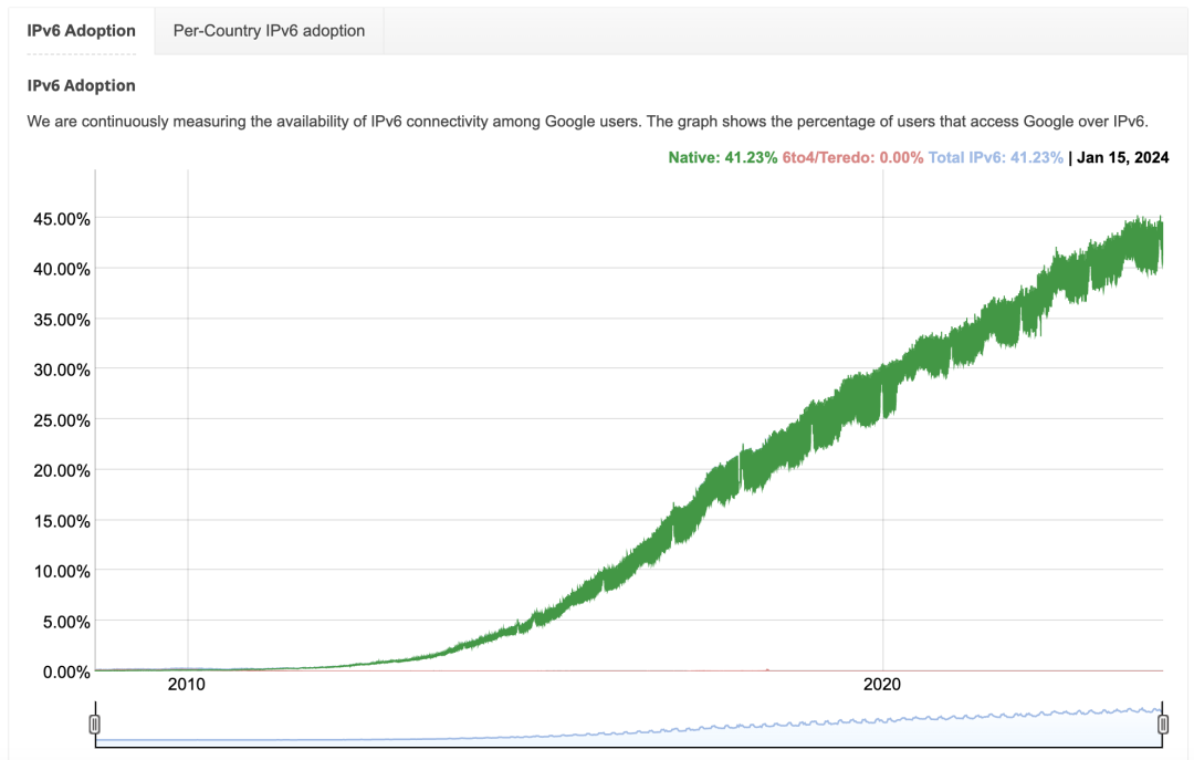 IPv6 的到来显然是件好事,但是据 Google 统计的数据显示,IPv6 推出十多年时间,截至 2024 年 1 月 15 日,互联网上使用 IPv6 的用户未达五成,占比 41.23%。