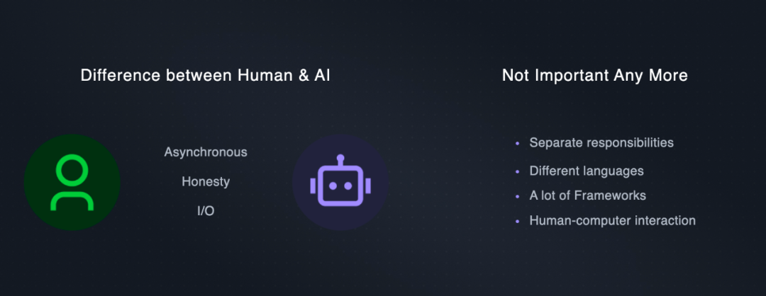 尽管人类和人工智能(AI)都拥有一定的智力能力,但在现阶段,大多数产品设计仍然以人类为中心,而非 AI。 以协作为例,单个人的工作能力有其天然的限制,因此需要与他人协同合作。这就导致了人类工作的异步性。在软件工程领域,我们使用 Git 这样的工具来解决异步协作带来的问题。 再比如,任何一个工程项目都需要经过生产和测试两个环节。考虑到确保工作的诚信性,通常我们不会让生产者和测试者是同一个人。但你完全可以让一个 AI 同时进行生产和测试,因为 AI 本身不存在诚信问题。 此外,人类和 AI 在交互方式上也存在着显著差异。比如,大部分的软件操作都需要使用鼠标,因为这种人类和 AI 在输入和输出(I/O)方式上的区别,导致 AI 其实很难操作现有的软件。