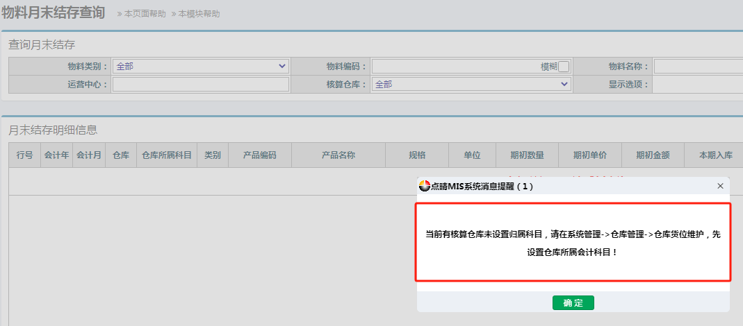 ![]() 在做结存分析时,提示需要做“当前核算仓库未设置归属科目”,如下图所示: