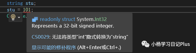 下来我们开始了解C#的面向对象方面知识,首先来认识一下面向对象。 面向对象: 面向对象程序设计(Object Oriented Programming,OOP)是一种计算机编程架构。OOP的一条基本原则是计算机程序由单个能够起到子程序作用的单元或对象组合而成。OOP达到了软件工程的三个主要目标:重用性、灵活性和扩展性。OOP=对象+类+继承+多态+消息,其中核心概念是类和对象。 通过百度百科来看,发现这说的是个神马玩意儿,还是给一个切实生活的例子来看,以洗衣服为例,设定两个对象,一个是洗衣机,一个是人,人去完成洗衣服这个动作,对于洗衣机有以下方法:洗衣服方法,脱水方法,烘干方法。对于人有以下方法:加衣服方法,加洗衣粉方法,按启动按钮方法。 然后开始执行这个流程:人加衣服--人加洗衣服--人按启动按钮--洗衣机洗衣服--洗衣机脱水--洗衣机烘干,通过一个个方法来完成洗衣服这个流程,简单来说就是某个对象执行某个动作完成某件事,而不是直接一步步执行方法,那是面向过程。 面向对象有三大特性:封装,继承,多态,在文章中会体现出来。 对于面向对象的概率有了粗略的了解,接下来先来了解如何检测异常 异常处理: 异常就是程序中有语法错误或者用户输入错误等等,这会导致程序无法运行,首先系统有它自己的异常处理方法,例如下面我定义了一个变量stu,类型为string,但我赋给它一个int类型数据,系统直接报错,说无法给stu一个int类型数据。
