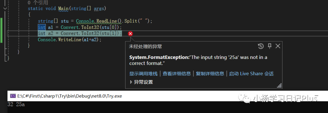 当我们想完成一个两个数加法运算,让用户输入数据,来执行加法,首先我们知道C#输入只能是字符串类型,要利用Convert来将string类型转为值类型来,而在输入时,如果用户输入错误,输入的不是数字,那程序就直接结束并报错,如下所示: