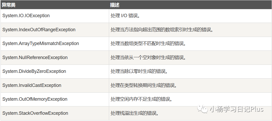 }关于有哪些异常我们来看菜鸟教程:异常类主要来自System.Exception类,所以Exception就包含所有可能的异常。