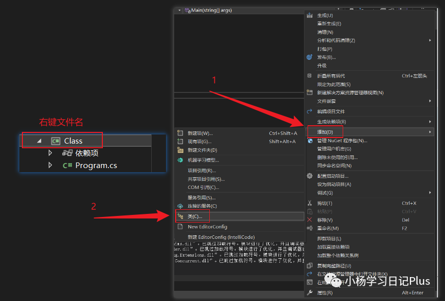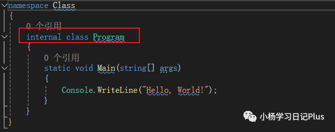可以发现当有异常时,系统除了会输出处于catch和finally中的语句外,不会执行其他的语句,当没有异常时才会接下去执行。 了解完异常处理,接下来开始面向对象的有关内容,首先是C#中的类。 类(Class: 当你定义一个类时,你定义了一个数据类型的蓝图。这实际上并没有定义任何的数据,但它定义了类的名称意味着什么,也就是说,类的对象由什么组成及在这个对象上可执行什么操作。对象是类的实例。构成类的方法和变量称为类的成员。 --- 菜鸟教程 类的定义: 关键字class,后面接类的名称,花括号中为类的主体。 如何创建一个类: 其实我们创建一个程序时,就创建了一个类,如图所示,这是一个刚创建的程序文件,它就自动生成一个名为Program的类,这个名字和文件名是一样的。