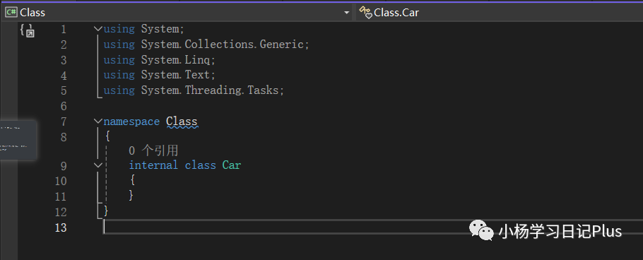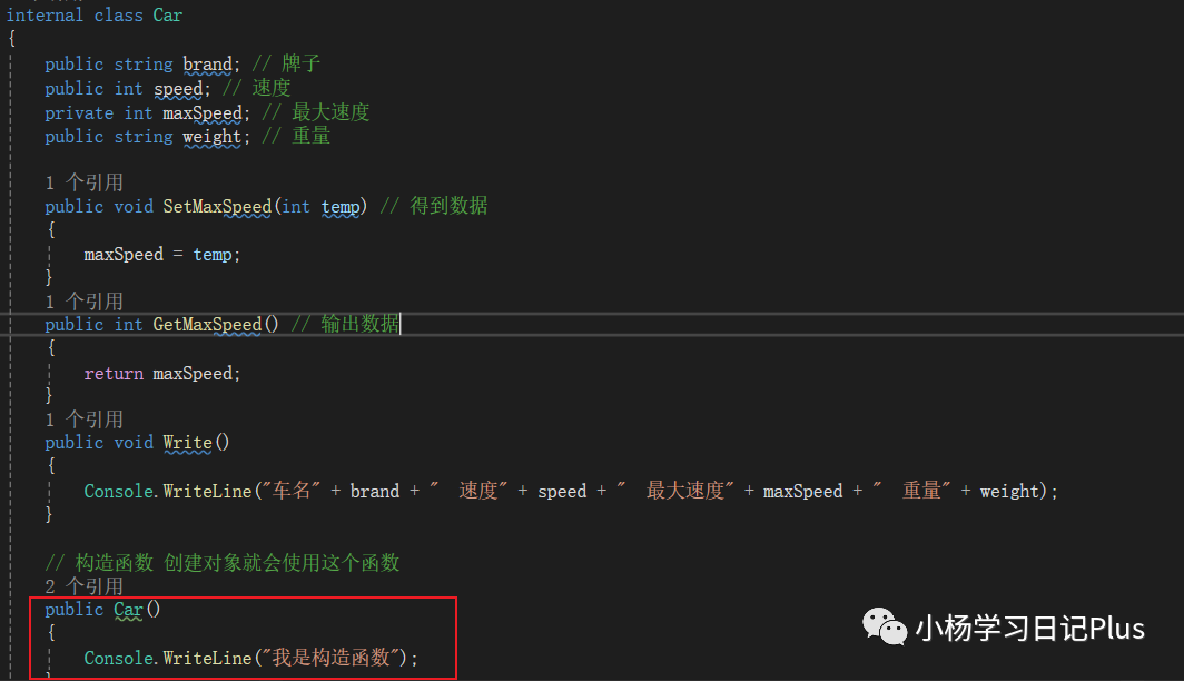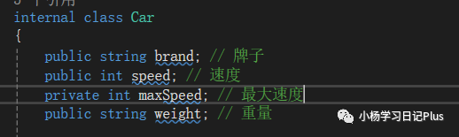 这样我们创建好了一个名为Car的类,这些using都是会自动生成的,然后我们可以给类中添加成员。成员要有访问表示符,默认为private(私有的),此时无法直接在其他类中使用,设为public(公共的)就可以随意使用了。 public string brand; // 牌子 public int speed; // 速度 private int maxSpeed; // 最大速度 public string weight; // 重量