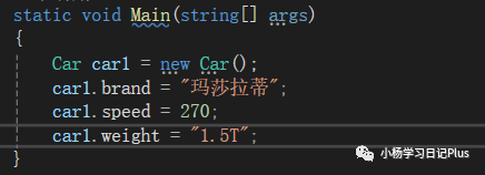 如何使用类中的成员:首先要new一个对象来使用这个类。如下所示: Car car1 = new Car(); car1.brand = "玛莎拉蒂"; car1.speed = 270; car1.weight = "1.5T";