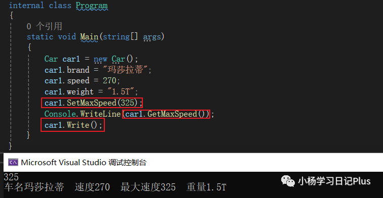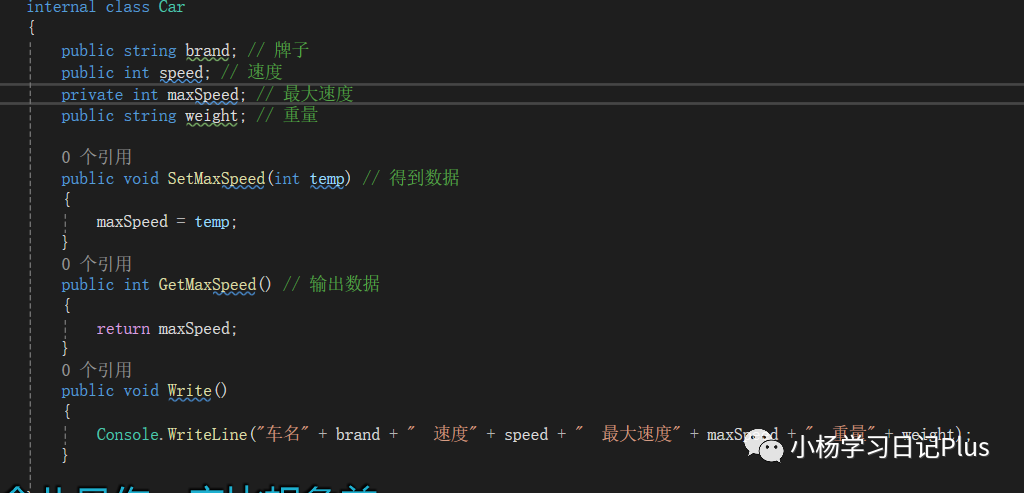 这样就可以使用类中定义的成员了,可以看到里面缺少了maxSpeed这个成员,因为它的访问符为private,所以不能直接使用,要在类中去添加方法。如下所示: public void SetMaxSpeed(int temp) // 得到数据