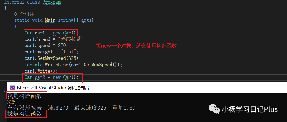 类的使用就可以体现出封装,将我们的一些方法写在一个程序中,在通过主程序去调用这个类中的方法,从而让主程序显的更加简洁明了。 构造函数: 构造函数是类中一个特殊的成员函数,构造函数的定义没有返回类型。定义构造函数后,每在主程序中创建一个新的对象就会使用这个构造函数。如下所示: public Car()