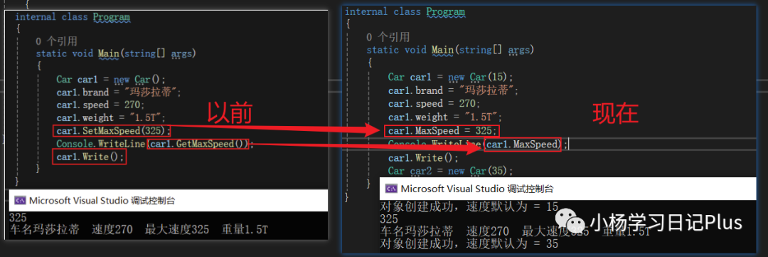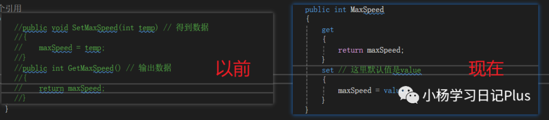 属性: 属性主要用于外部来访问和使用内部的私有成员变量,例如我们上面要使用maxSpeed变量,要定义两个方法才能使用这个变量,而使用属性就可以只定义一个方法就可以使用了。如下所示: public int MaxSpeed