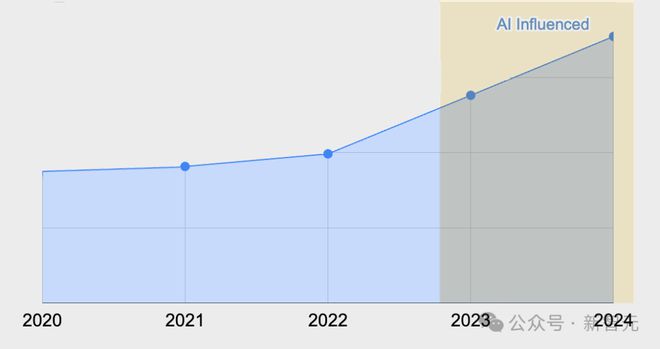 图中展示了 4 年中的代码改动率——编写后不到两周就被撤销或更新的代码行百分比,——深色部分表示受 AI 代码生成工具影响的时间。