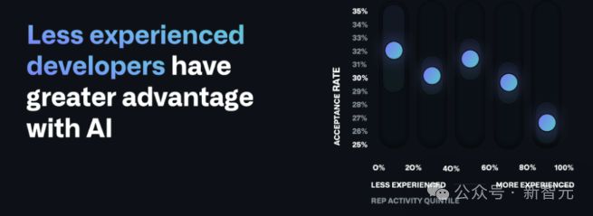 所以,相比于经验更丰富的开发人员,初级开发者更倾向于接受 AI 给出的代码建议: