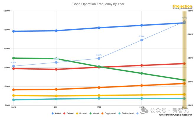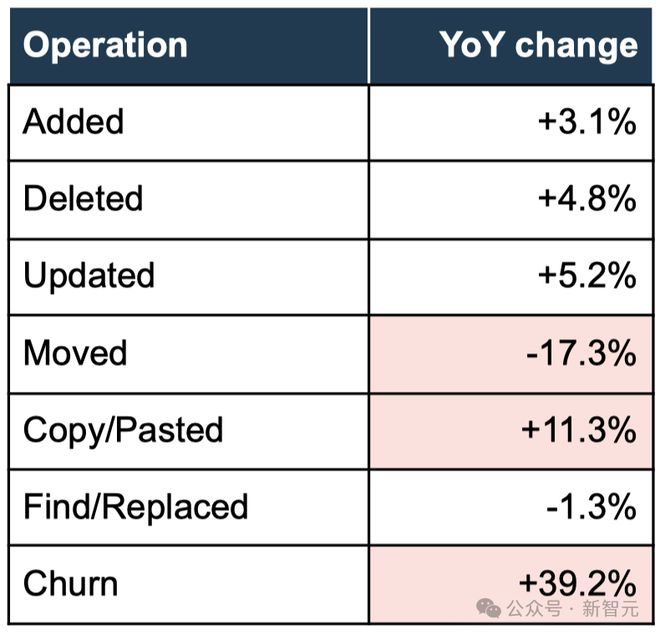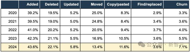 调查中同样发现,「新增代码」和「复制粘贴代码」的比例相对于「更新」、「删除」和「移动」代码的比例在增加。