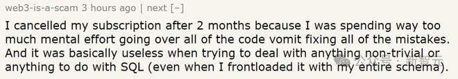 谴责型:「我在两个月后取消了订阅(Copilot),因为我花了太多精力去修复所有代码错误。而且在处理任何复杂的事情或与 SQL 有关的事情时,它基本上是无用的(即使我提前加载了整个模式)。」