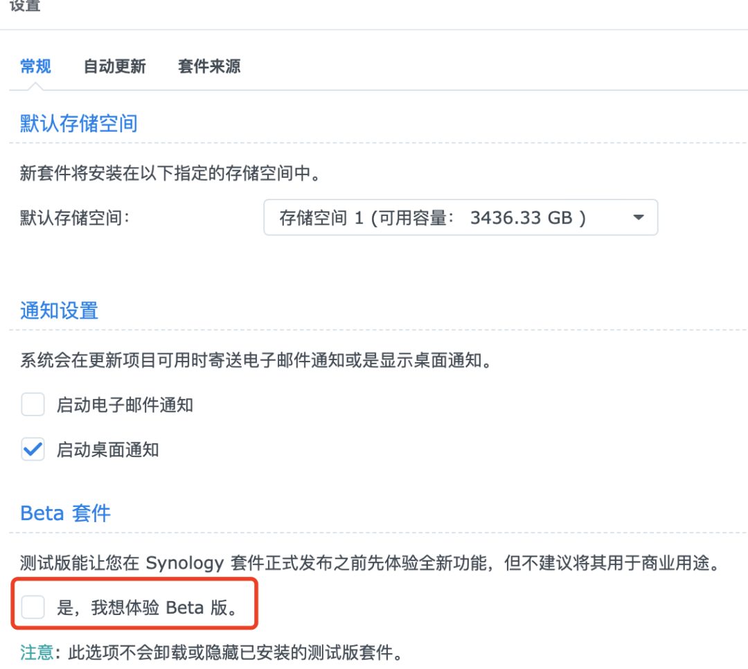 打开设置。首先看到的是默认存储空间设置,在这里更改新套件安装时的存储空间。如果想要在套件更新时收到通知,也可以勾选通知设置下的选项。最后的Beta套件,顾名思义就是测试版套件,不是正式版的套件,可能会有比较多的bug,如果想要抢先体验新功能,就可以勾选: