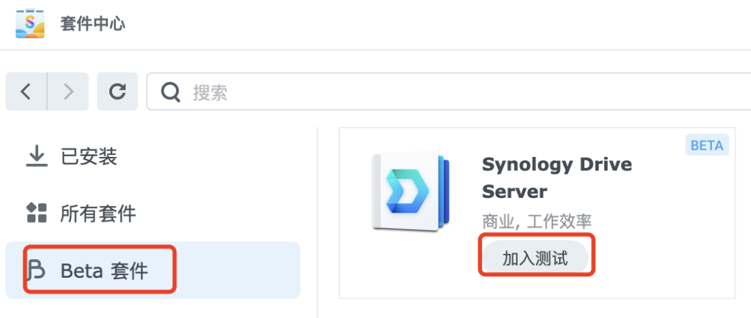 当勾选体验Beta版套件后,套件中心就会出现新的Beta套件选项。只要群晖发布了Beta版的套件,都会显示在Beta套件选项中。如果要加入测试,那么测试版本的套件会直接覆盖正式版的套件: