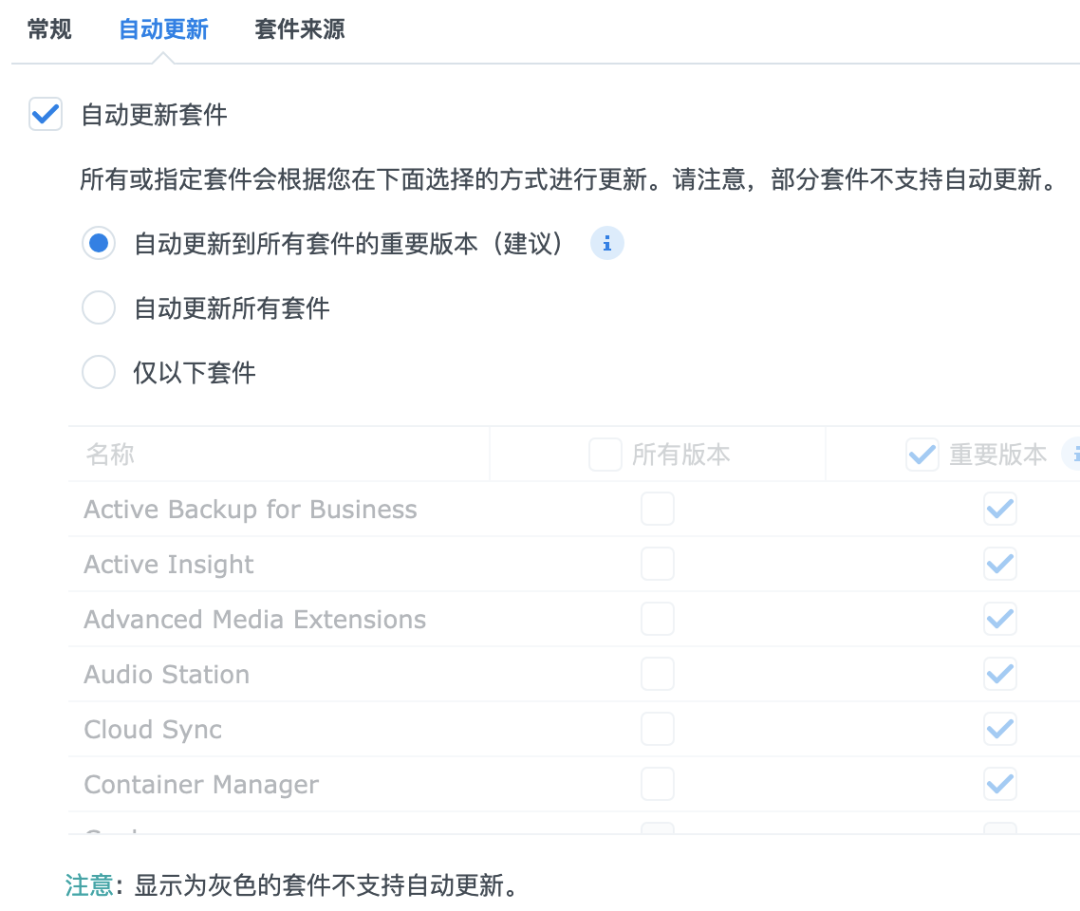 设置中,还可以在自动更新中配置套件更新规则。该功能对于企业来说更加友好,保证了套件在对企业提供服务时,不会因为自动更新套件而导致套件不可用: