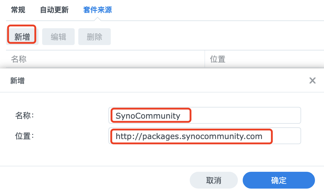 最后一个套件来源就是配置社群套件的地方。点击新增,输入名称套件来源地址,再点击确定: