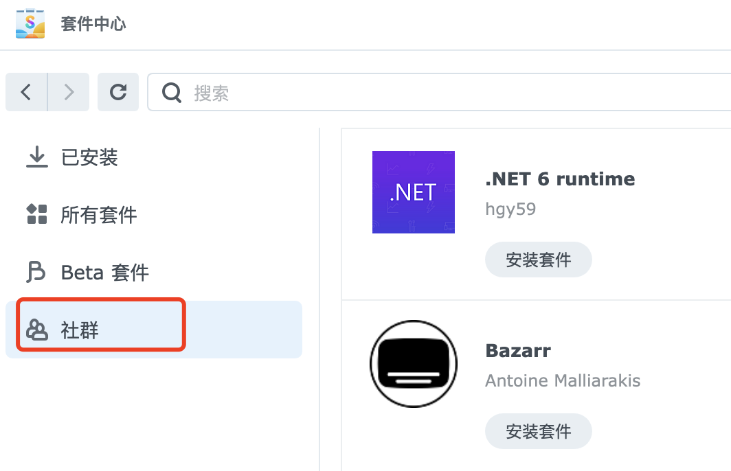 回到套件中心首页,和Beta套件一样,会多出一个社群选项。社群套件的安装方式和官方套件一样,点击安装套件按钮即可: