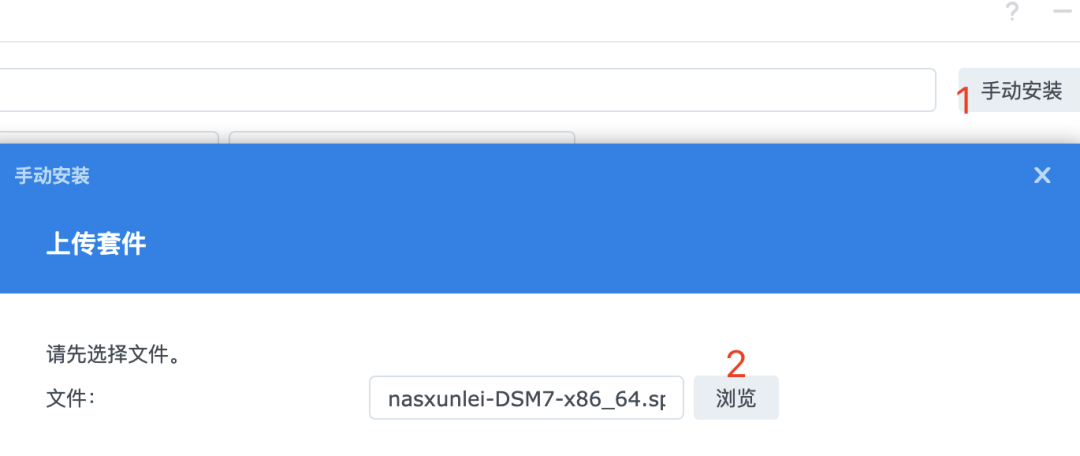 在套件中心点击手动安装后,点击浏览选择下载好的spk文件,再点击下一步: