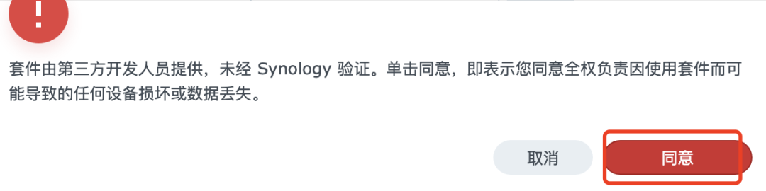 因为套件是由第三方提供,所以群晖会有提示,需要点击同意才能进行安装: