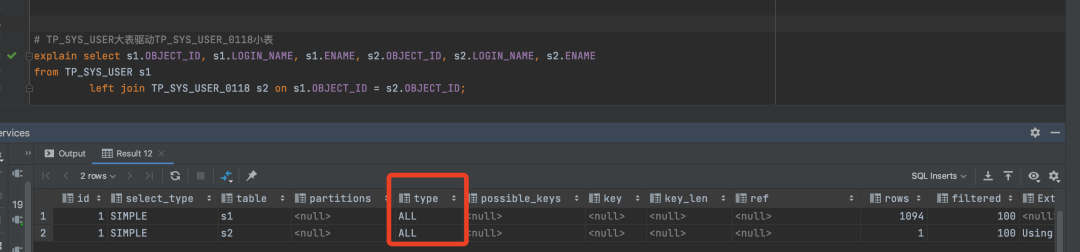 我们发现两个表的type都是ALL:表示全表分析,然后才找到匹配的行,我们可以通过字段rows看到查询的行数据。