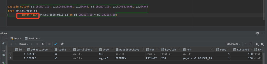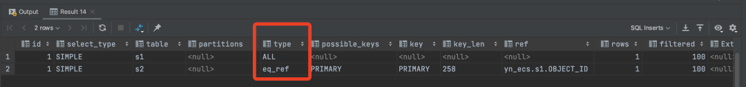 我们可以看到s2表的type是eq_ref:表示查询时命中主键 primary key 或者 unique key 索引,这里使用的是primary key。并且查询rows的行数是1