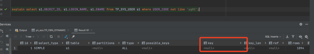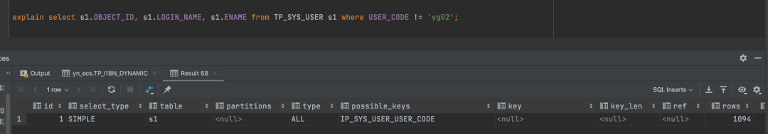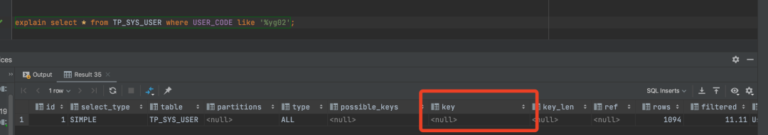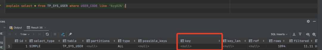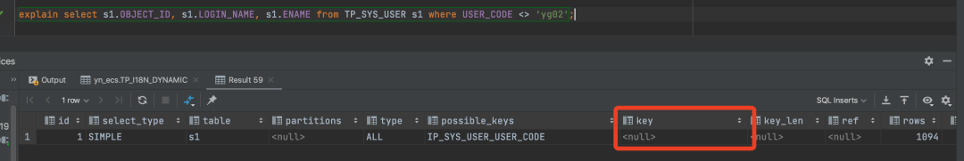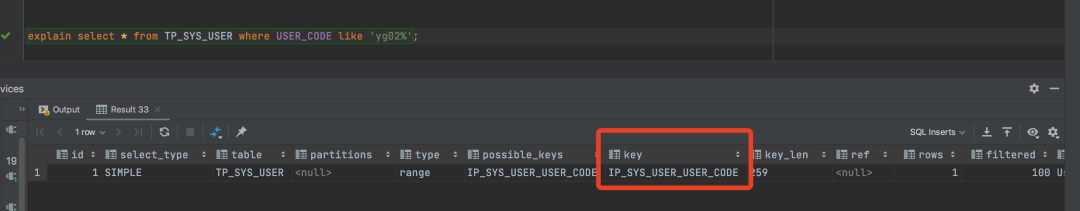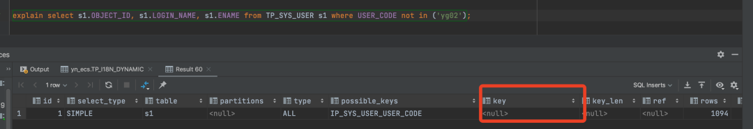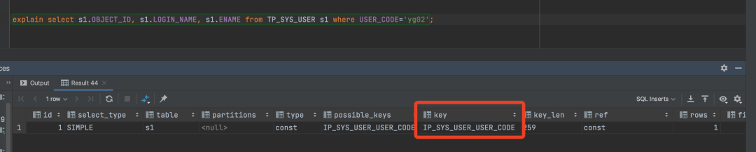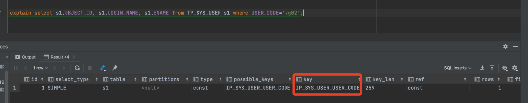 执行结果中key有值:表示查询中实际使用的索引为IP_SYS_USER_USER_CODE。