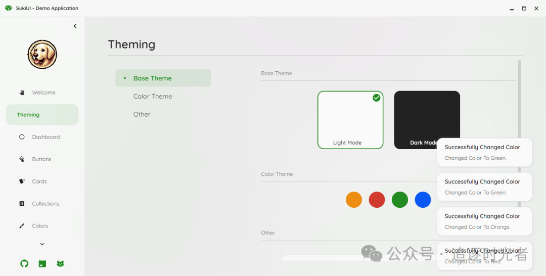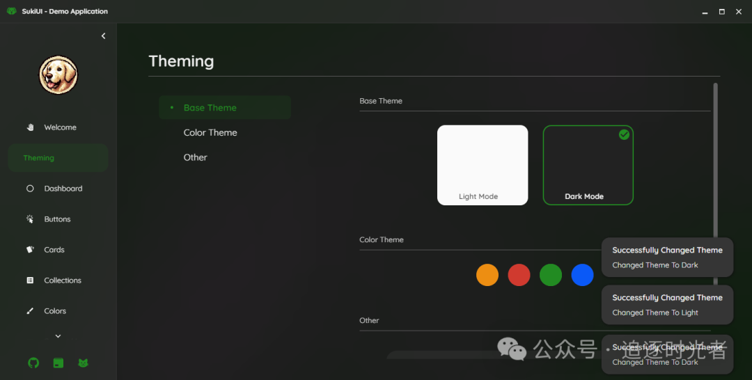 SukiUI 包含 AvaloniaUI 基本控件的主题,支持浅色/深色主题。提供了在不同颜色主题之间选择和切换以及创建自定义主题的能力。并且SukiUI还包含额外的控件,以提供制作丰富多样的用户界面的可能性。