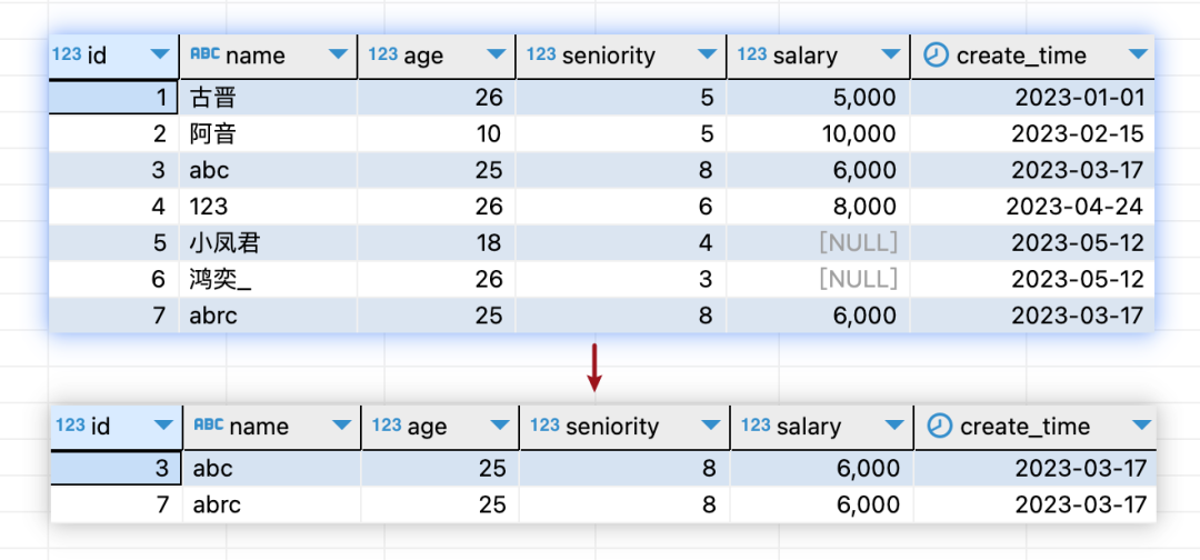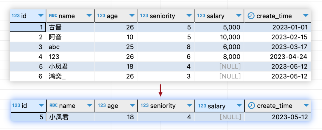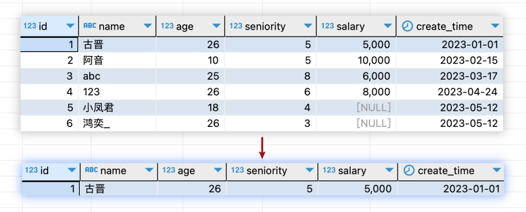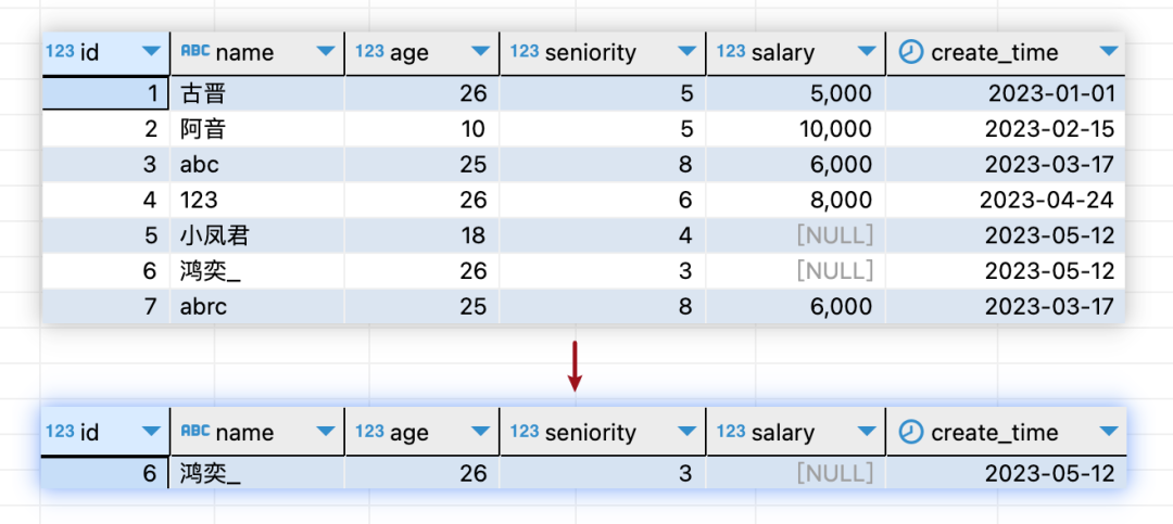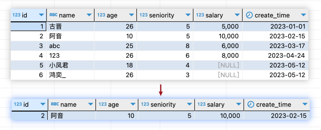 查询结果同上图结果一致,只返回古晋跟阿音2人。