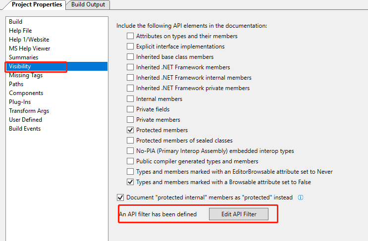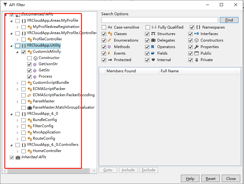 默认情况下dll中所有方法和属性都会生成对应文档,也可以根据自己需要只把DLL中需要的类或方法生成文档,可通过如下图配置: