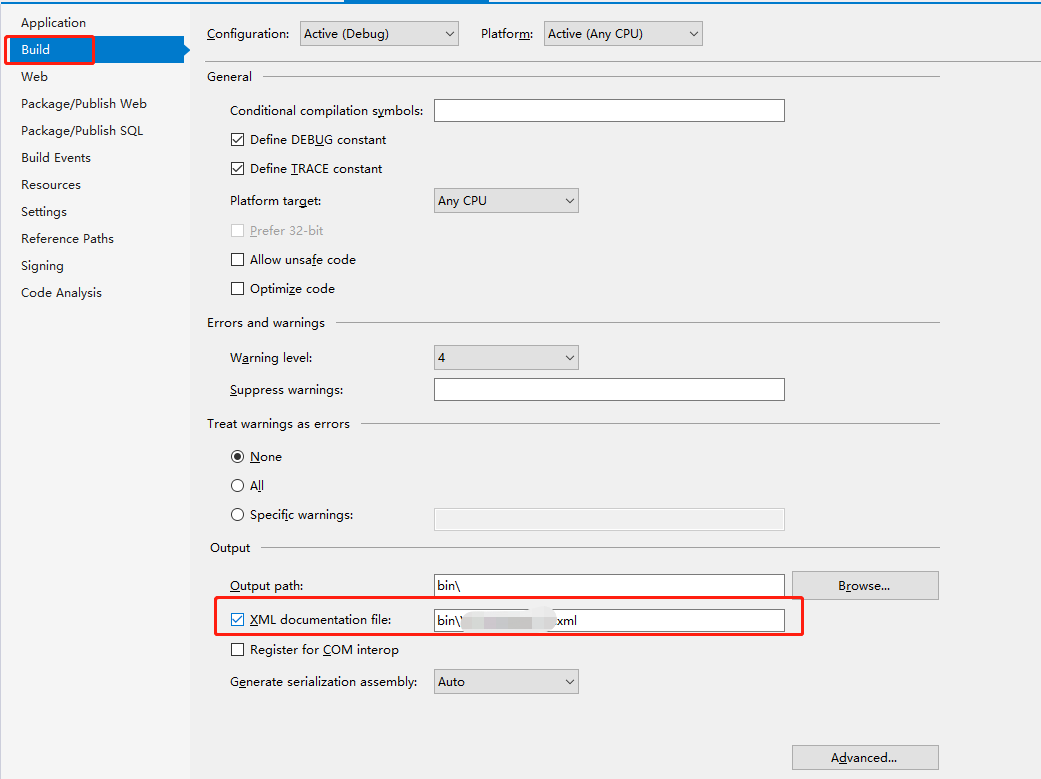 把"XML documentation file:"勾选,当编译时在生成DLL的同时还会生成一个和dll同名的xml配置文件。