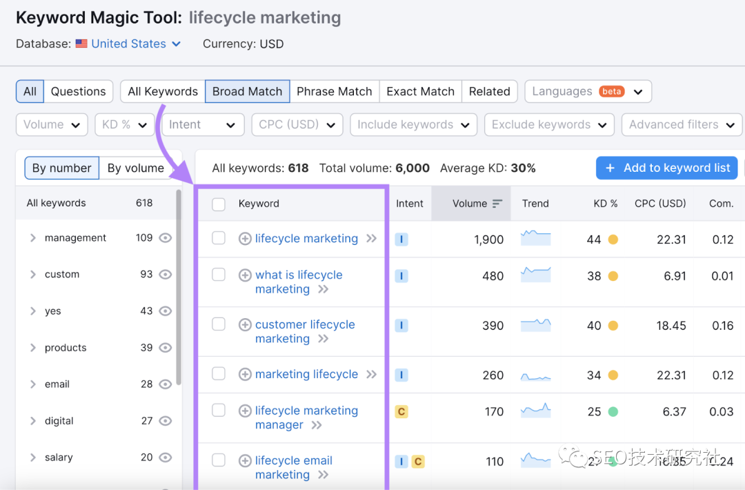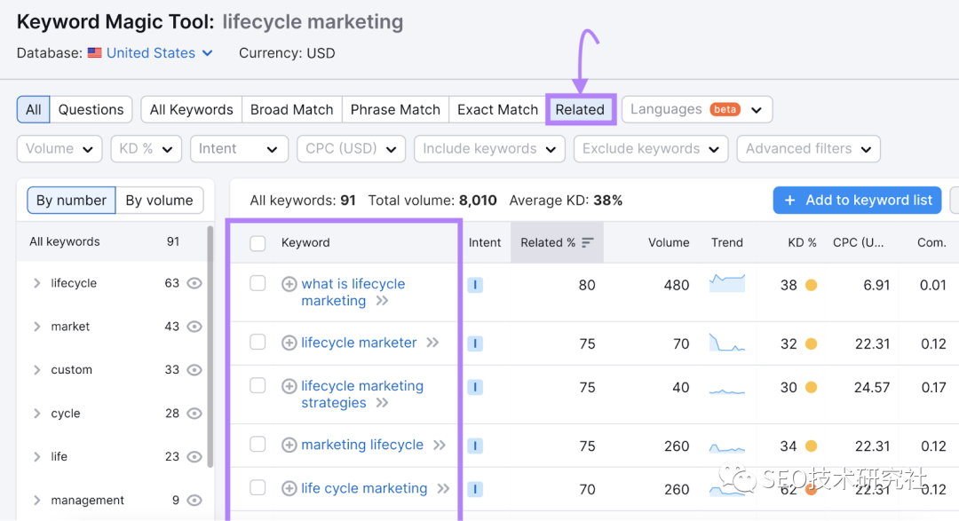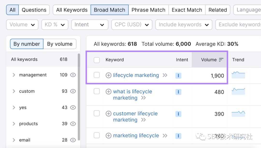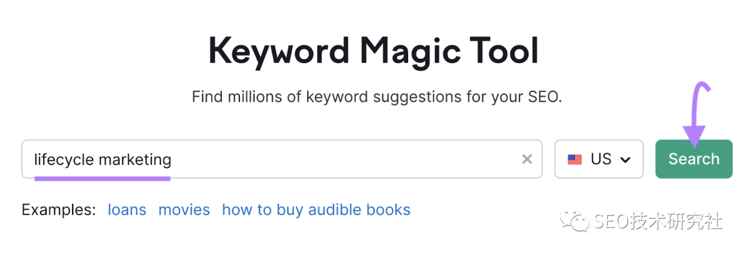 要了解您应该在内容中包含哪些特定关键字,请在工具中输入“生命周期营销”,选择您的位置,然后单击“搜索”。