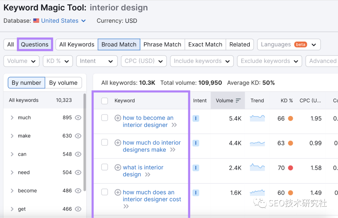 您也可以单击“问题”按钮以查看包含您的主要关键字的基于问题的关键字。