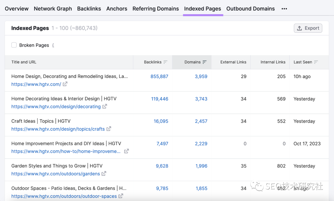然后,转到“索引页面”选项卡,查看他们的哪些页面具有最多的反向链接。
