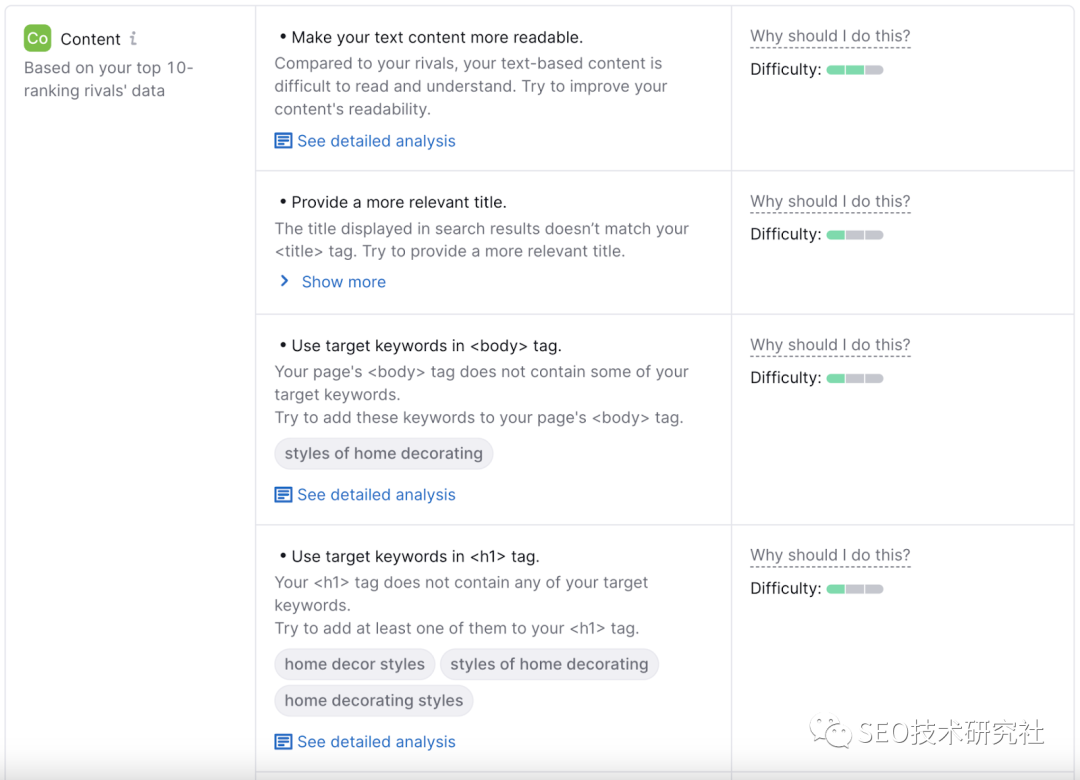 该工具显示了您可以实施的优化想法。并估计这些想法可以帮助您获得多少流量。