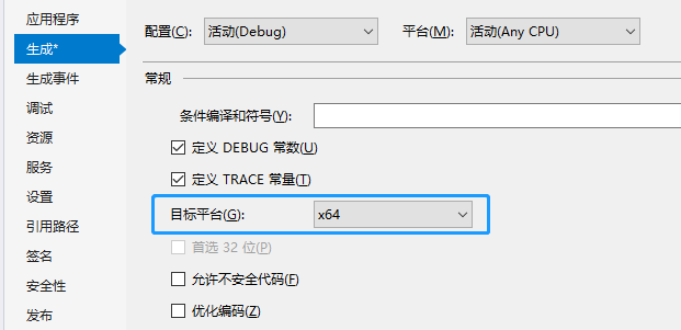 选择用于平台目标的任何CPU 是不够的,您还必须取消选中首选32位,否则该应用程序仍将以32位运行。将目标平台设置为“x64”即可: