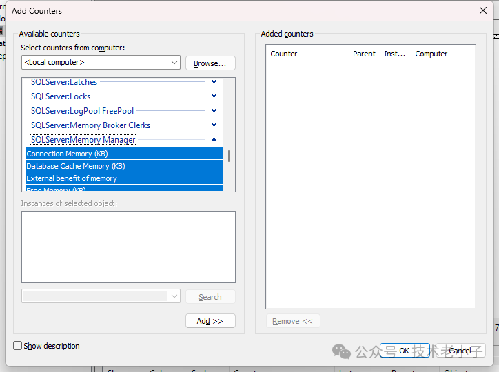 2. 在“添加计数器”对话框中,从列表中选择“SQLServer:General Statistics”和“SQLServer:Memory Manager”对象。