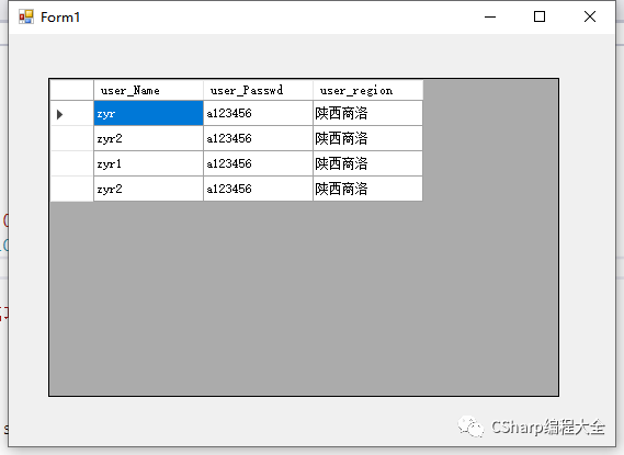 //解析方法            using (IDataReader read = db.read("select * from userInfo"))            {                while (read.Read())                {                    userInfo a = new userInfo();                    a.user_Name = read[0].ToString();                    a.user_Passwd = read[1].ToString();                    a.user_region = read[2].ToString();                    userInfo.Add(a);                }            }            this.dataGridView1.DataSource = userInfo;//将List的数据绑定到DataGridView中        }